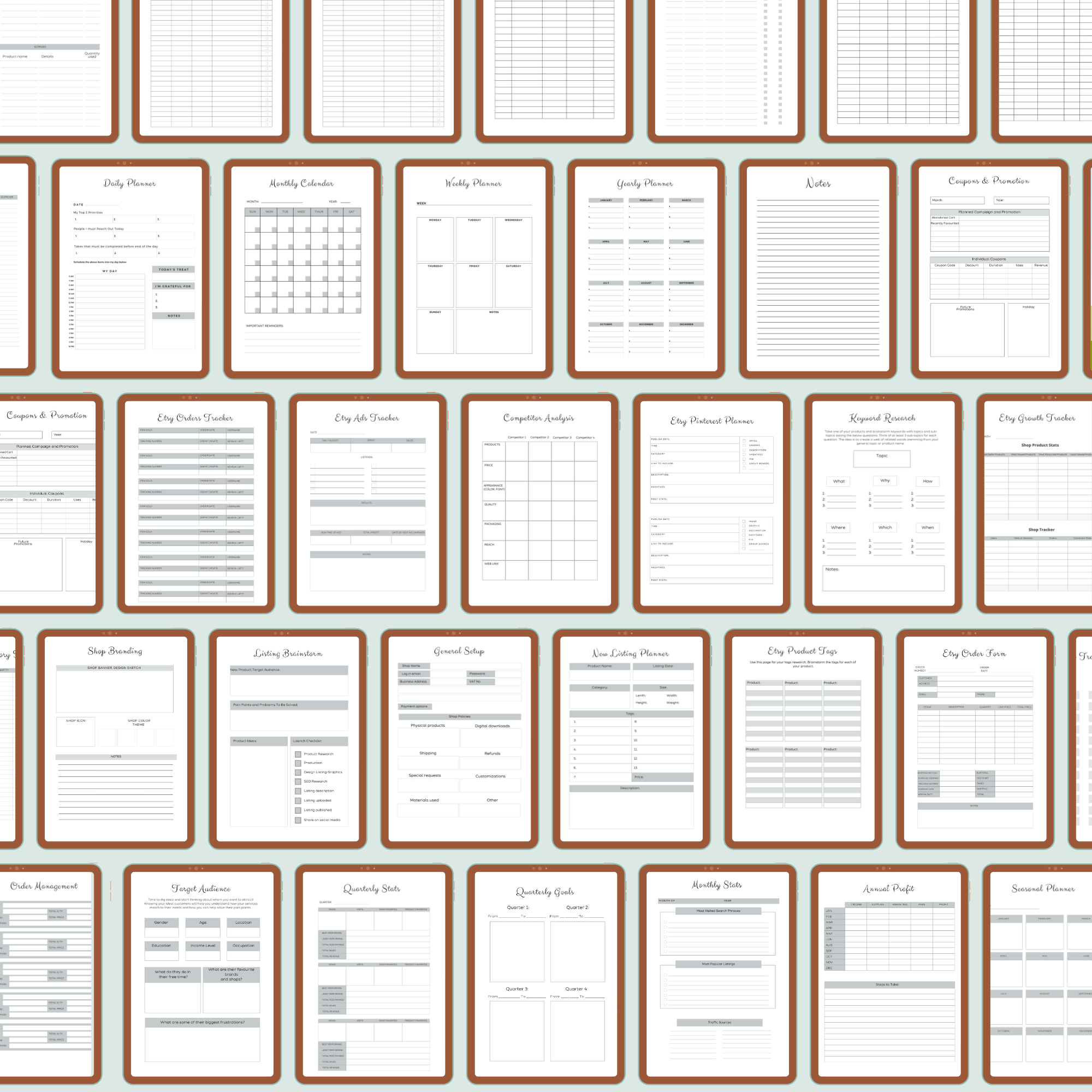 Designed for time-poor creators, it includes everything from listing planners to keyword trackers, goal-setting pages, sales and order forms, and even a Pinterest planner.