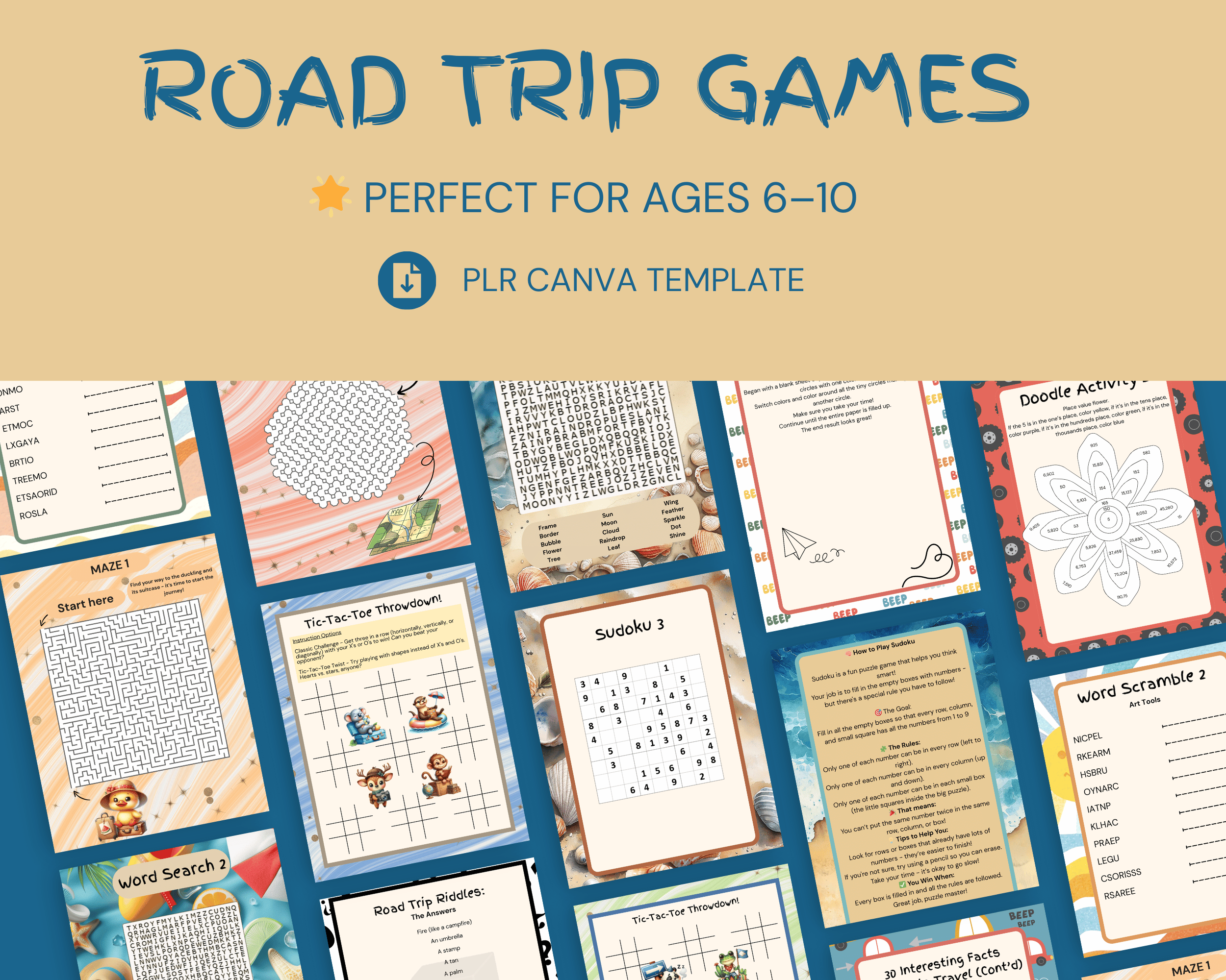 This 53-page PLR Travel Activity Pack is thoughtfully designed to keep children ages 6–10 engaged, curious, and happily screen-free - whether on road trips, flights, or family holidays.